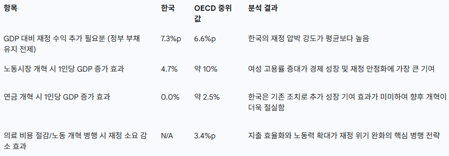 OECD 모델링 결과는 노동 시장 개혁과 지출 효율화의 결합이 재정 위기를 완화하는 핵심 전략임을 보여줍니다. 의료 비용 절감(비용 증가율 감소) 노력과 노동 시장 개혁을 병행할 경우, 2060년까지 필요한 추가 재정 소요가 OECD 국가 중위값 기준으로 3.4%p 감소하는 효과가 있는 것으로 분석됩니다.