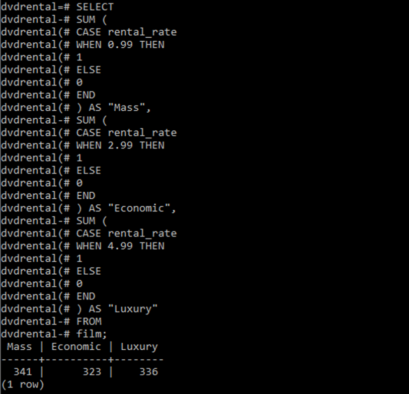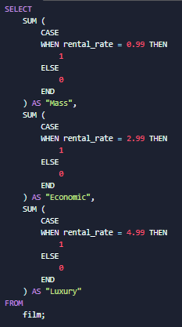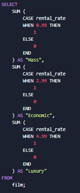 여기에서는 샘플 데이터베이스의 필름 테이블에 대해 작업합니다. 다음 논리를 사용하여 영화에 가격 세그먼트를 할당한다고 가정합니다.