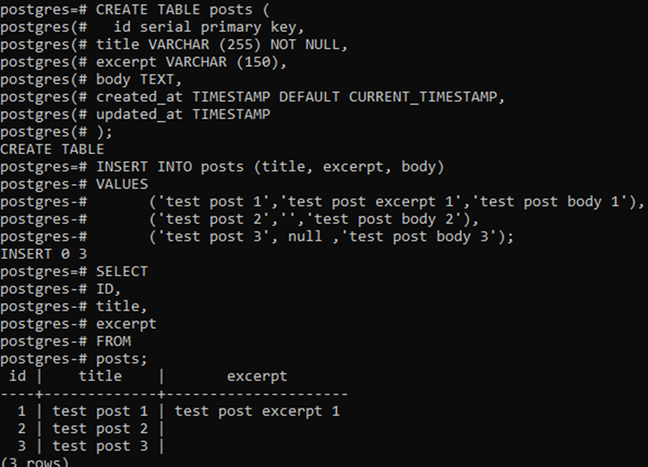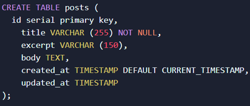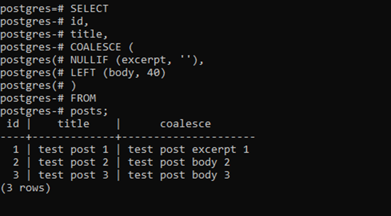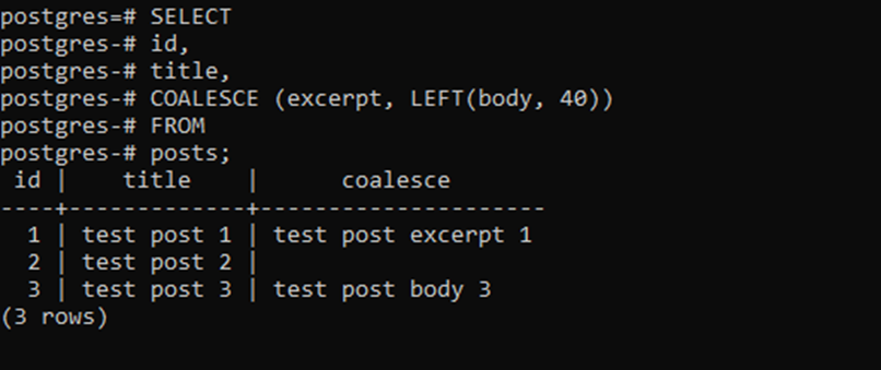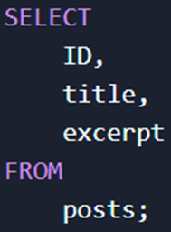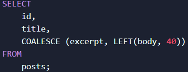 우리의 목표는 각 게시물의 title과 발췌문을 보여주는 게시물 개요 페이지를 표시하는 것입니다. 발췌문이 제공되지 않은 경우 게시물 본문의 처음 40자를 사용합니다. 다음 쿼리를 사용하여 posts 테이블의 모든 행을 가져올 수 있습니다.