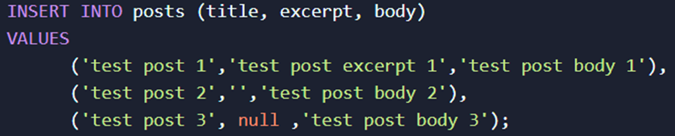 이제 다음과 같이 몇 가지 샘플 데이터를 테이블에 삽입합니다.