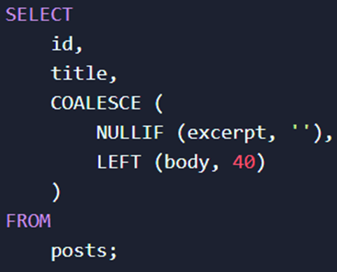 발췌 열의 null 값입니다. 이 null 값을 대체하기 위해 다음과 같이 COALESCE 함수를 사용할 수 있습니다.
