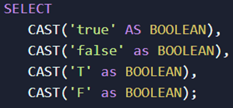 이 예에서는 CAST()를 사용하여 문자열 'true', 'T'를 true로, 'false', 'F'를 false로 변환합니다.
