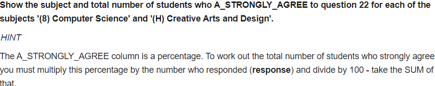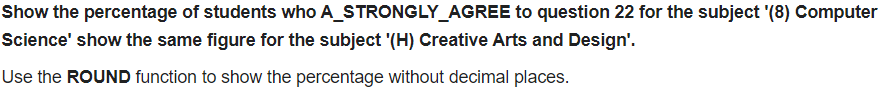 SELECT subject, ROUND(SUM(response*A_STRONGLY_AGREE)/SUM(response),0)