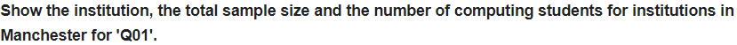 문제 8.' Q01'에 대한 맨체스터 내 기관의 기관, 총 샘플 크기 및 컴퓨팅 학생 수를 보여줍니다.