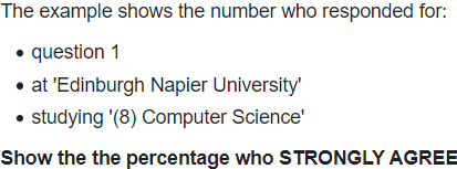 문제 1. 다음 예시에서는 다음에 응답한 번호를 보여 줍니다. 1번 문제입니다. '에딘버그 네이피어 대학교'에서요 '(8) 컴퓨터 과학'을 공부합니다. 강력하게 동의하는 비율을 표시합니다.