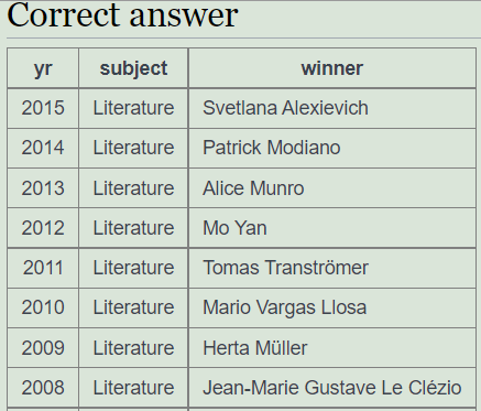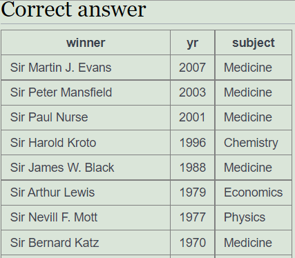 SQL Zoo 04 - SELECT from Nobel Tutorial
