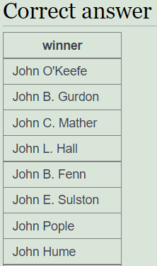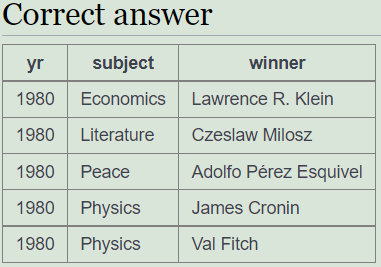 문제 1. 표시된 쿼리를 변경하여 1950년 노벨상을 표시하십시오.