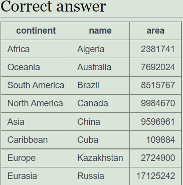 문제 7. 각 대륙에서 가장 큰 나라(면적 기준)를 찾아 대륙, 이름 및 지역을 표시합니다.