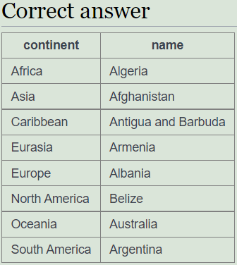 문제 3. 아르헨티나나 호주를 포함하는 대륙의 나라 이름과 대륙을 나열하시오. 국가 이름을 기준으로 정렬합니다.