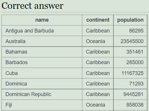 문제 9. 모든 국가의 인구가 <= 25000000인 대륙을 찾아보세요. 그리고 나서 이 대륙들과 관련된 나라들의 이름을 찾으세요. 이름, 대륙 및 인구를 표시합니다.