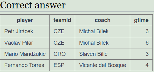 문제 1. The first example shows the goal scored by a player with the last name 'Bender'. The * says to list all the columns in the table - a shorter way of saying matchid, teamid, player, gtime.