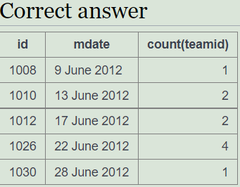 select mdate, team1, sum(score1) as score1, team2, sum(score2) as score2