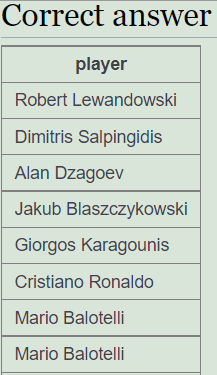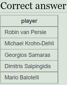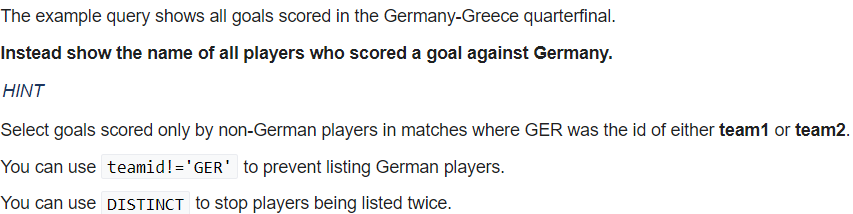 문제 8.The example query shows all goals scored in the Germany-Greece quarterfinal.Instead show the name of all players who scored a goal against Germany.