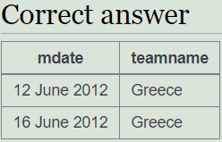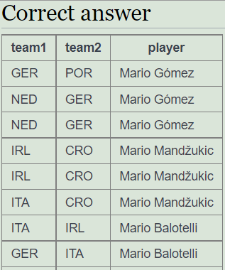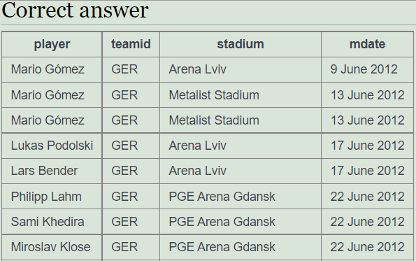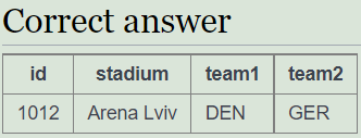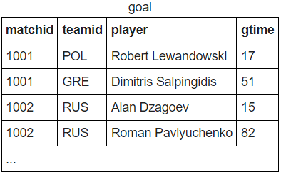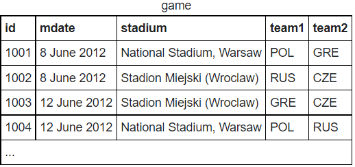 Notice in the that the column matchid in the goal table corresponds to the id column in the game table. We can look up information about game 1012 by finding that row in the game table.