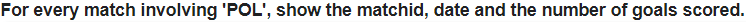 문제 11.For every match involving 'POL', show the matchid, date and the number of goals scored.