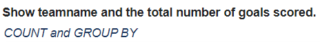 문제 9.Show teamname and the total number of goals scored.COUNT and GROUP BY