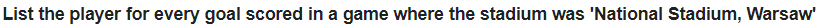 문제 7. List the player for every goal scored in a game where the stadium was 'National Stadium, Warsaw'
