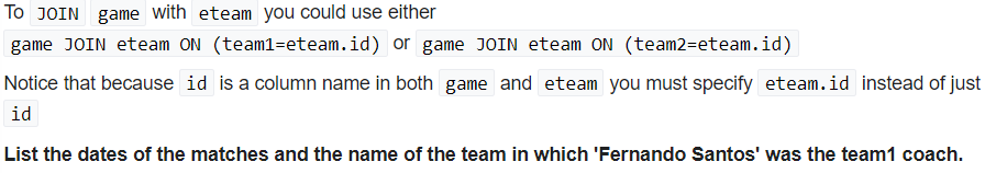 FROM eteam JOIN game ON (team1 = eteam.id)