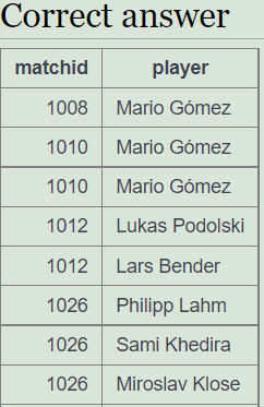 Modify it to show the matchid and player name for all goals scored by Germany. To identify German players, check for: teamid = 'GER'