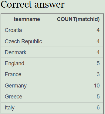 문제 10.Show teamname and the total number of goals scored.COUNT and GROUP BY