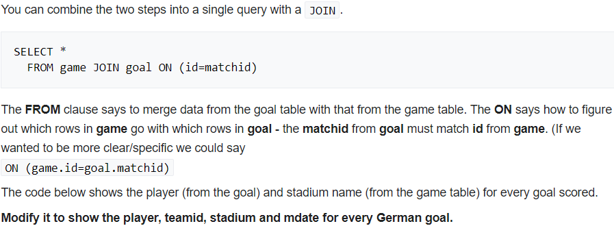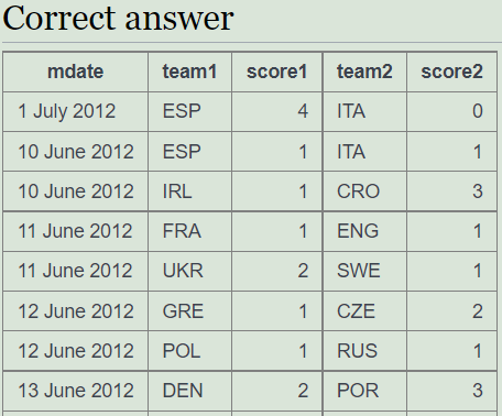 Notice in the that the column matchid in the goal table corresponds to the id column in the game table. We can look up information about game 1012 by finding that row in the game table.