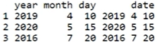 test.df <- data.frame(year = c(2019, 2020, 2016), month = c(4, 5, 7), day = c(10, 15, 20)