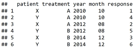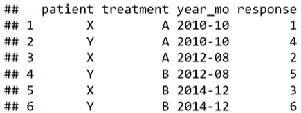 treamtments <- data.frame(patient = rep(c('X', 'Y'), 3), treatment = rep(c('A', 'B'), each = 3), year_mo = rep(c('2010-10', '2012-08', '2014-12'), each = 2), response = c(1, 4, 2, 5, 3, 6))