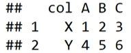 wide_df <- data.frame(col = c('X', 'Y'), A=c(1, 4), B= c(2, 5), c=(3, 6))